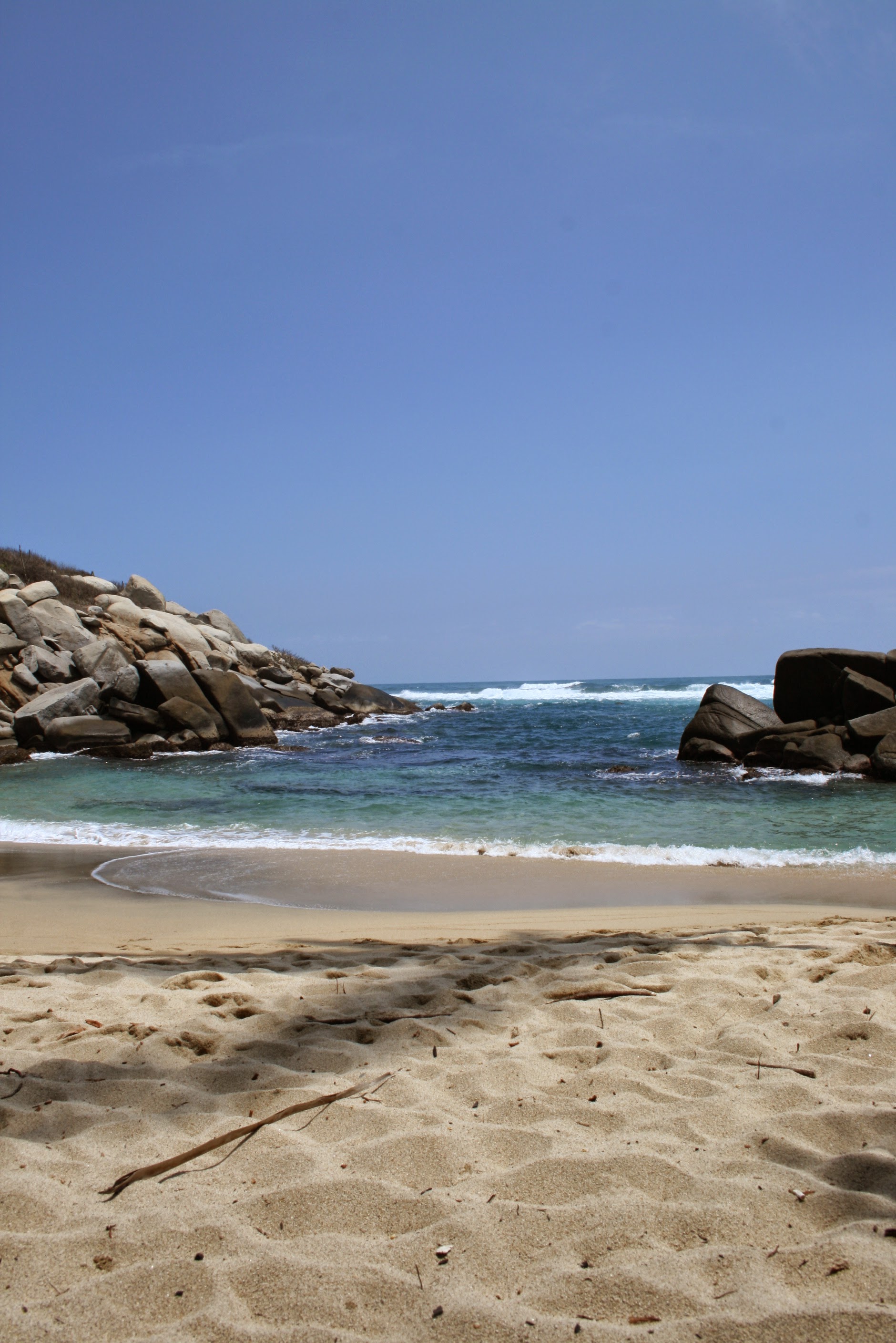 The next morning, we went to the Lonely Planet-recommended bakery 5min up the Arrecifes beach for 3000 pesos pain au chocolat. So I got to sit on a little mocked-up breakfast bar, looking through a row of palm trees onto the ferocious waves of the Caribbean Sea, breaking onto the beach while eating the world’s most indulgent pain au chocolat and drinking black Colombian coffee. At 8am on a Monday morning. What a difference 3 months make. After bidding my new mates of 1 day and of ½ day goodbye, as they were heading onwards to Palomino, I set off for Cabo San Juan, the 3rd beach up from Arrecifes which is supposedly the prettiest of the three beaches at the eastern end of the park. It was. There, I found some shade and set up camp for the day and passed away the time reading ‘Orange is the new black’, getting the notes for the last 4 days updated in my calendar, eating a really crappy lunch as the avocados, bananas and bread were not coping well with the heat and being shoved indiscriminately into my bag (the pears were the least planned but best preserved food item I brought with me from Santa Marta) and swimming in the bay. Lots. I ran into people from my hostel in Cartagena and from my hostel in Santa Marta, proving once again that the travelling circuit is predictable. In the evening, I got chatting to a random group of people which included two absolutely lovely medics from London who managed to nail the final nail in the coffin for any concerns I might have had about the safety of backpacking in Colombia as they shared stories of their time here. And for that, I’m very thankful. Because Colombia still has a weird effect on even some of the most hardened backpackers. I’ve met people who have done all of South America and when they hit the Colombian border, they admitted getting worried about safety. Something about the reputation of Colombia still sits in the back of people’s minds until they get here and experience the country properly. Travel decisions that they wouldn’t think twice about in Bolivia, in Peru, in Chile, in Argentina, suddenly get weighed up and considered. I’m lucky to have started at this end of the country, where most people finish, because it means I get to hear a lot of stories and accounts of how there is no more reason to worry here than anywhere else. And I think that will stand me in good stead when I finally do leave the Caribbean coast behind for the rest of Colombia.