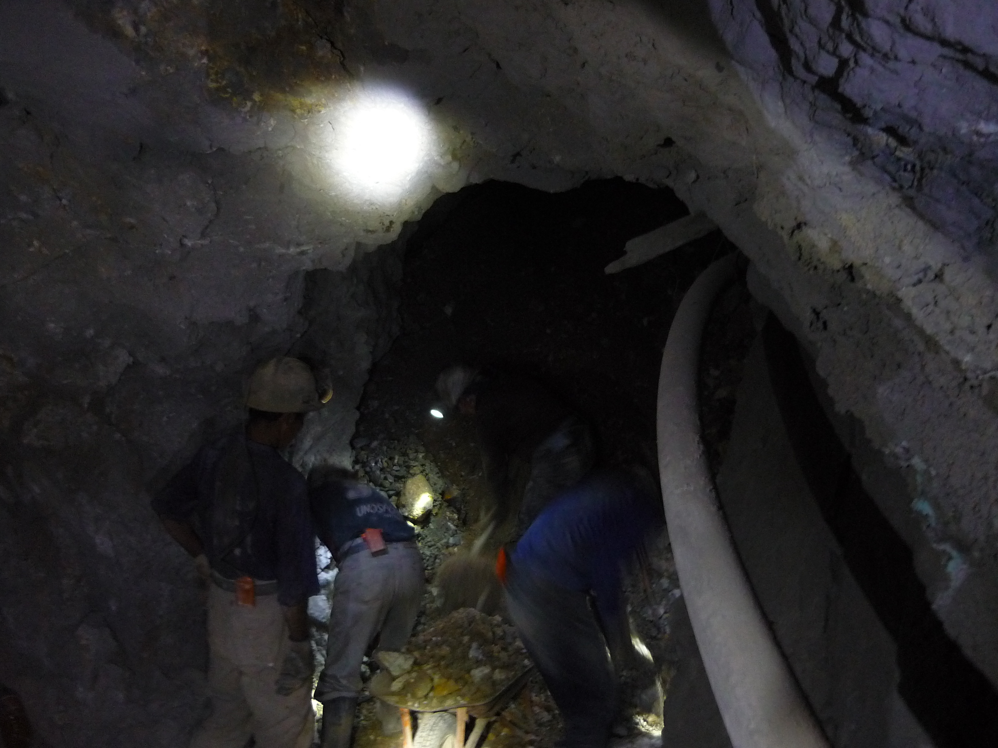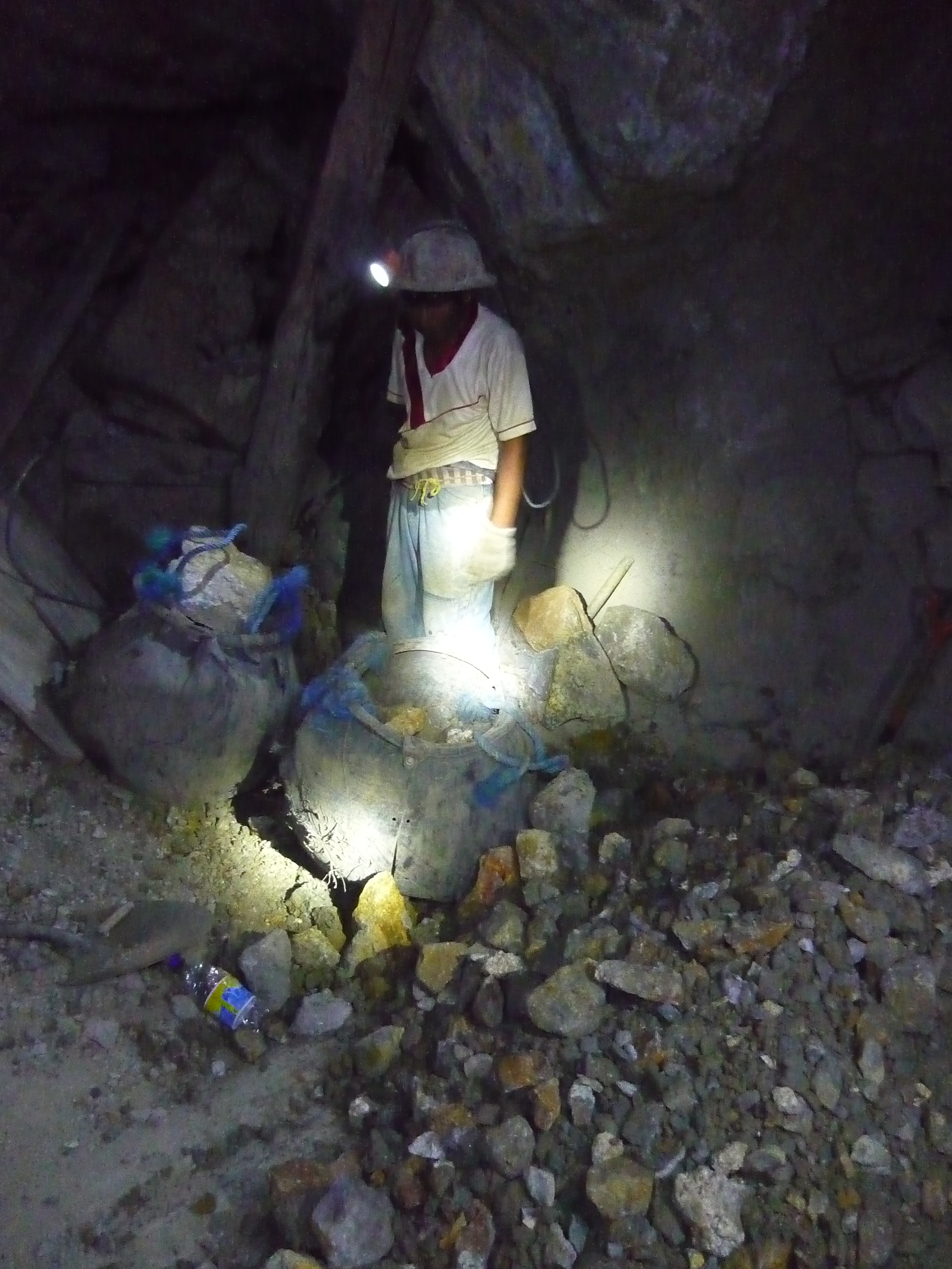 Because Sucre was such a nice place and the people I met there so great (I even managed to finally catch up with someone I met at La Serrena in Salento who I’ve been more or less doing the same route as since then but we’ve always just missed each other) I decided to head to Potosí on a day trip instead of spending any nights there. Potosí is the silver city, surrounded by mines containing silver, zinc and tin that have been worked for about 500 years. The history of how the Spanish worked these mines, the slaves they brought over to work them and the wealth they took from them goes deep into the history of Bolivia as a nation and its people and I’d spent a lot of time thinking about whether or not doing a mine tour was something I wanted to do. A part of me felt that it was a very voyeuristic way to see Potosí and for a long time I wasn’t sure I was very comfortable with that. But I heard stories from other travellers and it seemed to have had a real impact on most of them so in the end I decided to do it. Another guy from my dorm joined me and we got to Potosí after a 2-hour shared taxi drive with a family of 4 with the most quiet baby I’ve ever shared public transport with, and joined the afternoon tour with a recommended agency. We got kitted out in protective clothing and rubber boots (bad day not to wear socks – I had to improvise a pair using plastic bags) and a helmet with a head torch, set off to the miners market to buy some presents in case we were to run into any on our way (they like dynamite, 96% alcohol, soda and coca leaves. We went for the dynamite ‘pack’ – a stick of dynamite, a bag of ammonium nitrate and a 3 min. fuse at the cost of 22 Bol.), visited a processing plant and then headed to the Rosario mine on the outskirts of the town. We were in the mines for 2 hours with our guide (who was a miner for 2 years himself) and met 2 sets of miners working a Saturday because the upcoming Monday was a holiday and they needed a full week’s worth of work.
